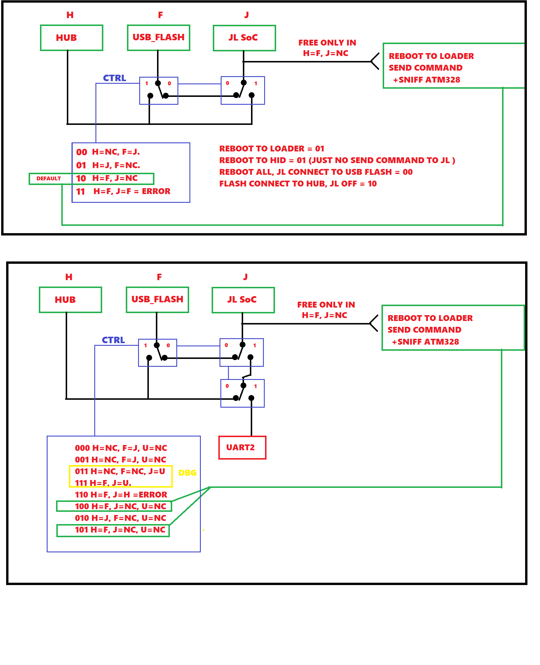 Так как атмега и JL всегда подключены, то ключи стоят от JL до хаба, или до флешки. Что бы перевести в бутлоадер - нужно отключиться от хаба (ну только из за этого мне нужны ключи, что бы не слать всякую фигню на хаб.) - а так как ключи переключают только, у них состояние или подключено одно или другое, (так мы коммутируем чип с компом или с флешкой), то когда мы переводим в бут, то автоматом отключаем хаб, и подключаем флешку, (или одно или другое, хаб отлетает сразу, остается флешка), думал что воткнутая флешка будет мешать переводить в бутлоадер. А вот и нет, работает все с параллельно воткнутой флешкой, пусть оно шлет на флешку хлам вместо хаба, пофигу, да и осликом ткнул - ну даже секунды нету сигнала на ножках. Зато с донгла можно переключаться , проверил 3 режима, перевод в бутлоадер, включение и подключение флешки (в сдк должен быть автостарт подключенных устройств, мы не эмулируем подключение усб, это что бы не нарушать работу сдк) и включение чипа и подключение в роли аудиокарты/усб устройства.