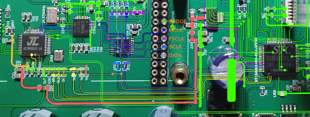 От аманеро сигнал DSDOE также идёт на STC, и как я понял, сигнализирует о формате сигнала - PCM или DSD. И оно так потом настраивает AK4493 на соответствующий формат данных.